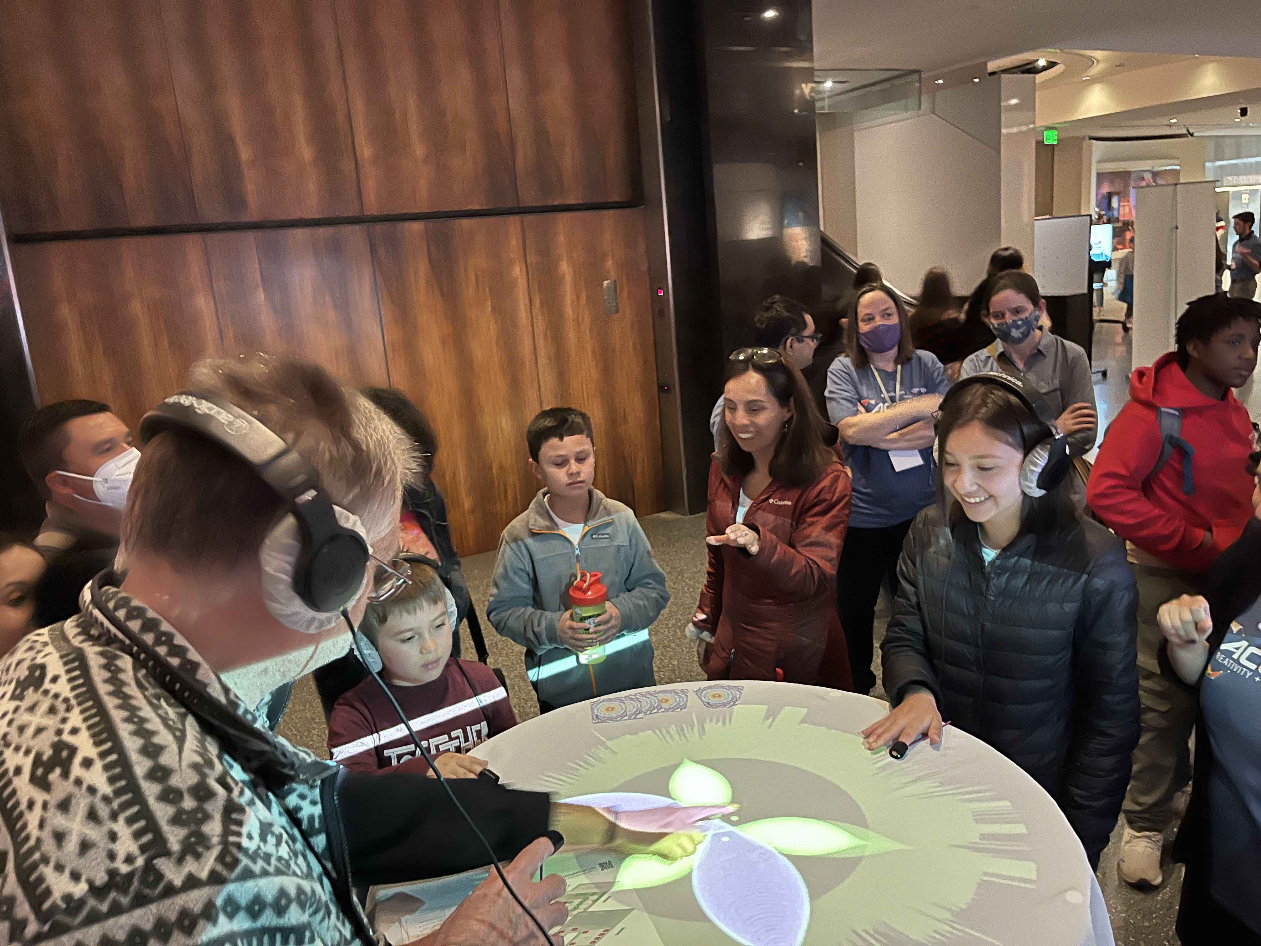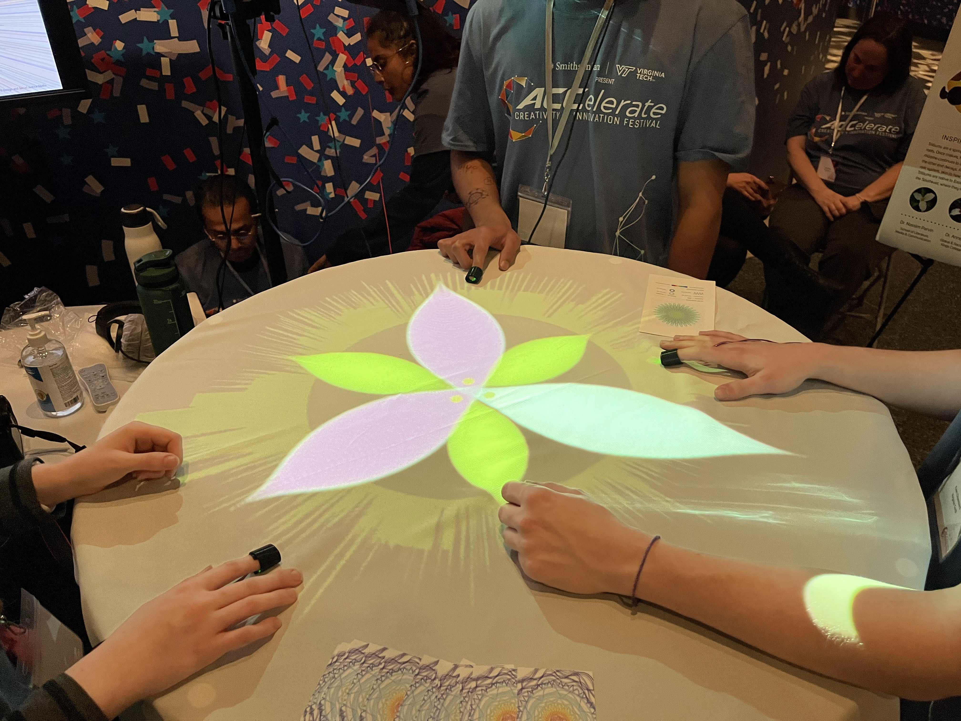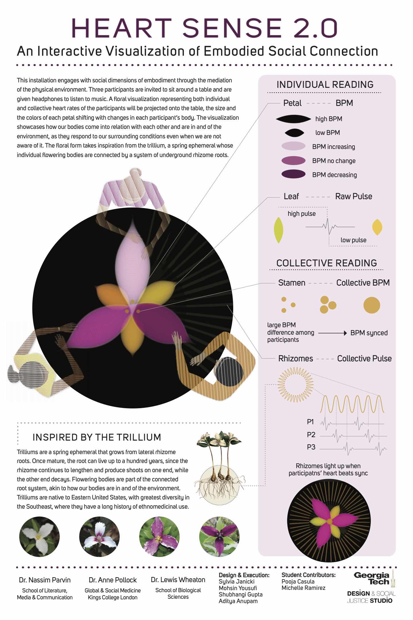 This installation engages with social dimensions of embodiment through the mediation of the physical environment. Three participants are invited to sit around a table and are given headphones to listen to music. A floral visualization representing both individual and collective heart rates of the participants will be projected onto the table, the size and the colors of each petal shifting with changes in each participant’s body. The visualization showcases how our bodies come into relation with each other and are in and of the environment, as they respond to our surrounding conditions even when we are not aware of it. The floral form takes inspiration from the trillium, a spring ephemeral whose individual flowering bodies are connected by a system of underground rhizome roots.
