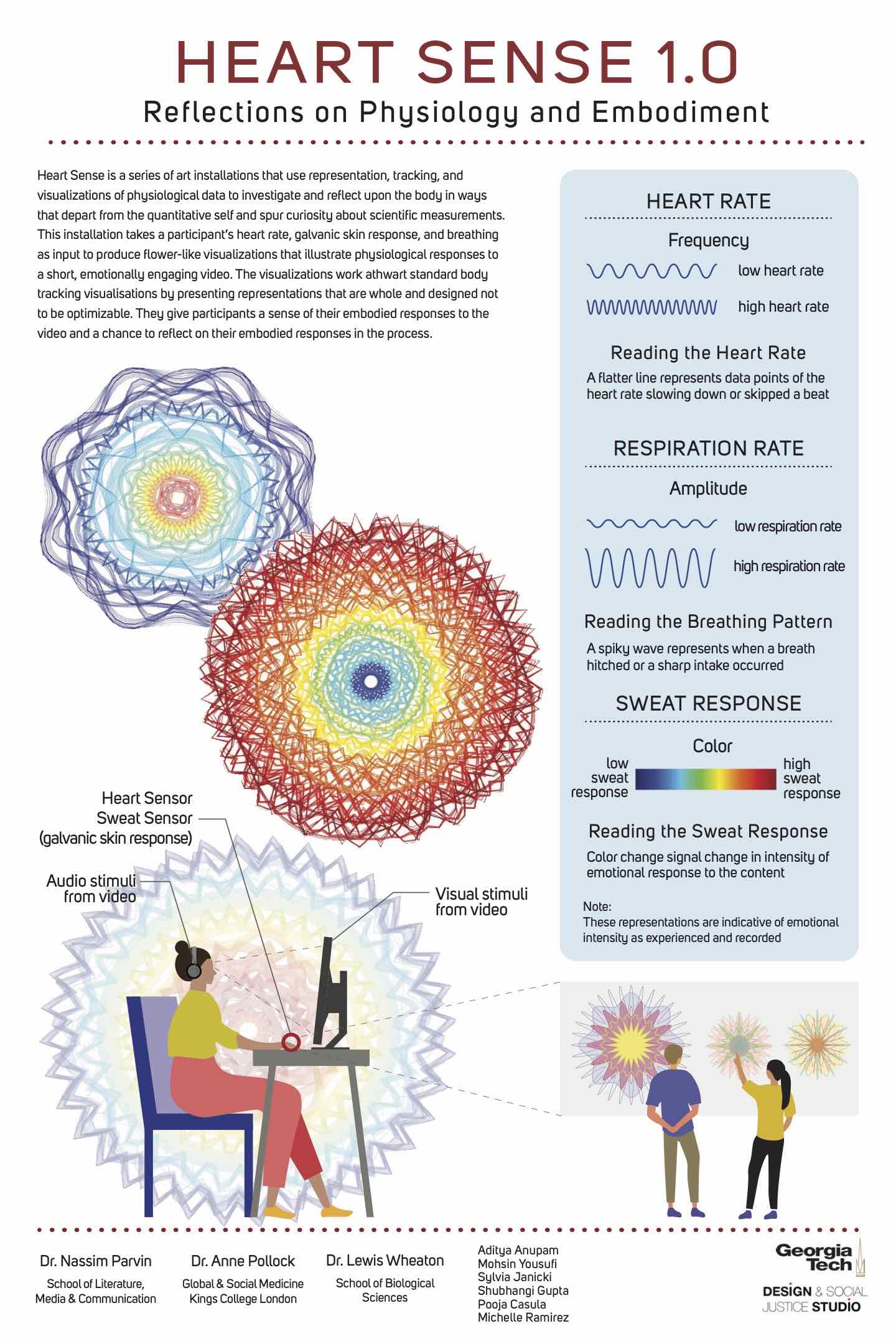 This installation takes a participant’s heart rate, galvanic skin response, and breathing as input to produce flower-like visualizations that illustrate physiological responses to a short, emotionally engaging video. The visualizations work eschew standard body tracking visualisations by presenting representations that are whole and designed not to be optimizable. They give participants a sense of their embodied responses to the video and a chance to reflect on their embodied responses in the process. Each heart visualization displays a person's physiological response to watching an emotionally-engaging video. Different physiological characteristics (heart rate, galvanic skin response, and breathing patterns) were used as variables to create a flower-like visualization.